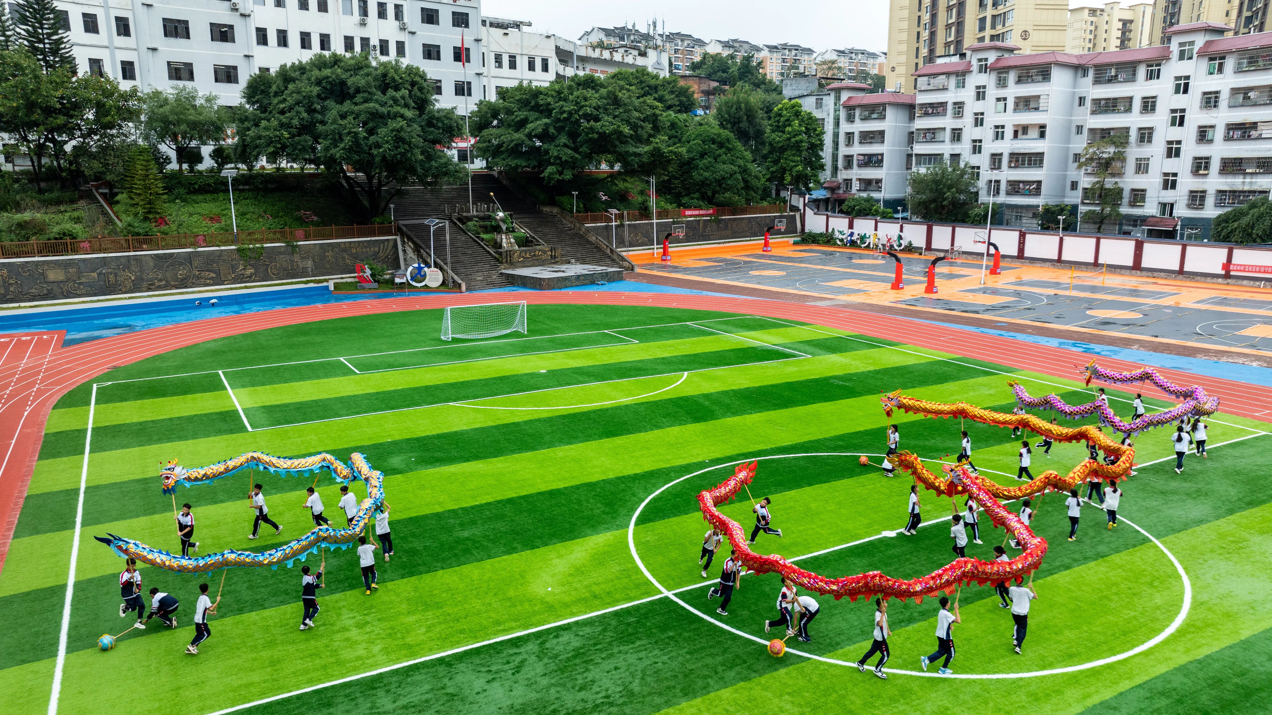 学校还开展校园足(排)球等阳光体育活动,推广普及耍麒麟、丢糠包、糠包舞、武术、唢呐等独具民族特色的体育课程,全面提升学生基本运动技能和专项运动技能,为培养全面发展的复合型人才奠定坚实基础。