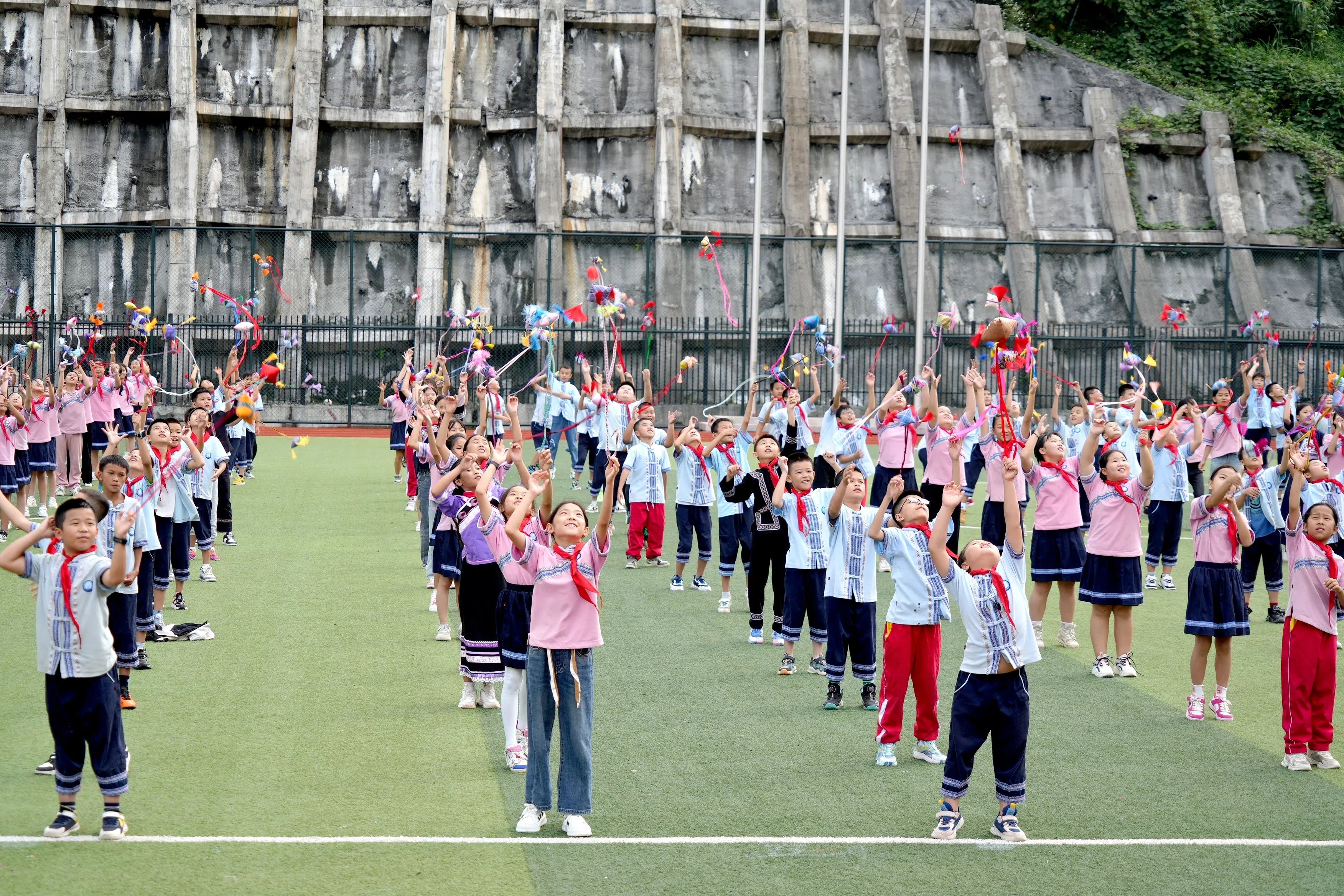 学生们身着绚丽的布依族传统服饰,衣服上绣着精美的图案,手持精心制作的糠包,随着悠扬的布依族古歌乐曲《赛和乜》响起,操场上瞬间变成了欢乐的海洋。在欢快的节奏中,学生们开始了“布依糠包舞”表演。他们的舞步轻盈而有力,每一次旋转、每一次跳跃都充满了生命的活力与韵律。手中的糠包仿佛被赋予了生命,时而高高抛向空中,时而在身前身后灵巧地舞动,宛如秋日里翩翩起舞的彩蝶,在诉说着布依族古老而动人的故事。