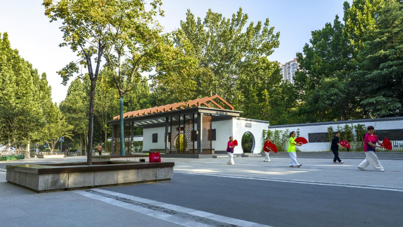 市民在口袋公园晨练。