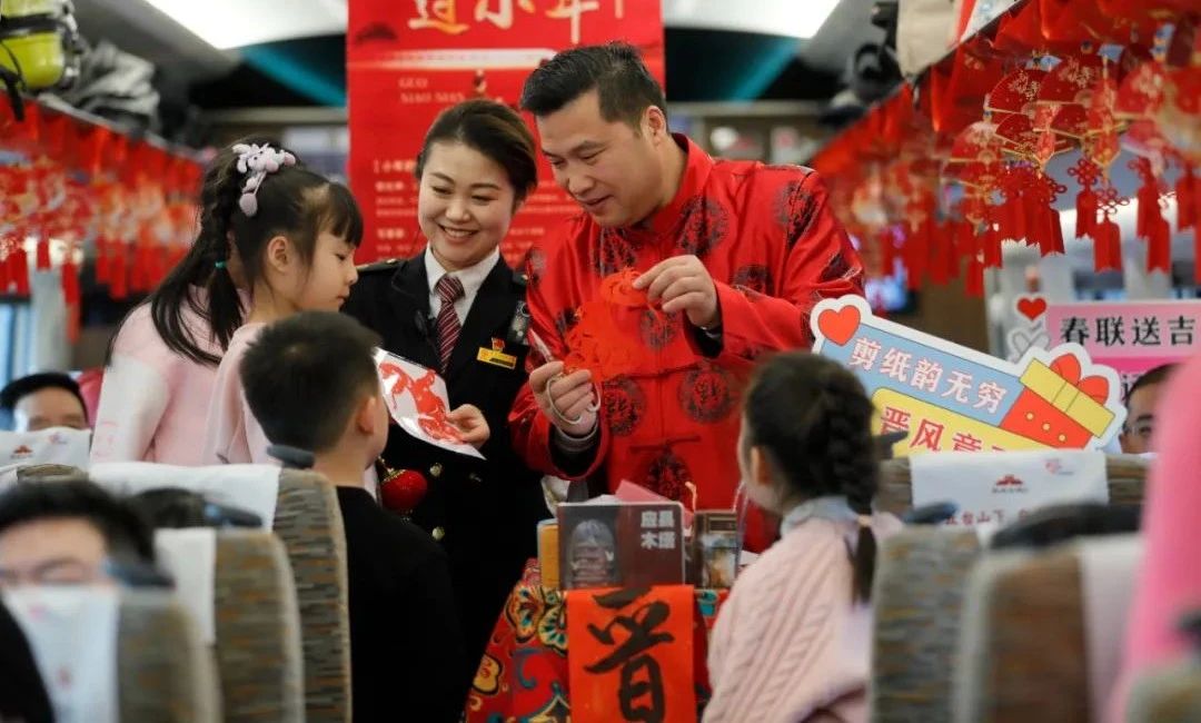 G1391次列车上,红灯笼高高挂起,窗户上贴满了精致的窗花,乘客们带着大包小包的年货归心似箭,每个人的脸上都洋溢着回家过年的喜悦。
